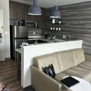 The kitchen and dining table. The kitchen had everything but an actual oven but the stovetop and microwave definitely sufficed.
