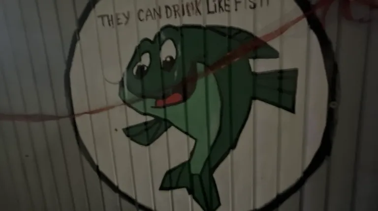 Looks like a sign with a catfish hanging off of it.