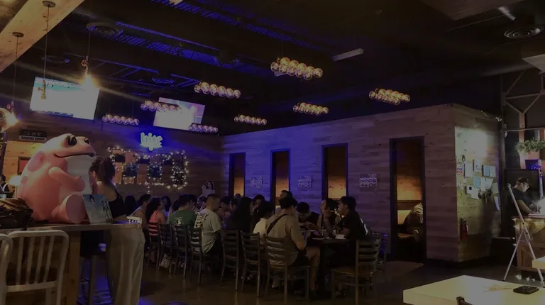 At an "introductory course" to Soju, "Soju 101" where the instructor, an oversized pink Jinro frog, teaches you the ways of getting wasted while singing karaoke. The food here - Korean Gastropub fare - is great and cheap, and I got a cheese corn, japagetti, a steamed egg bowl, a make-your-own kimchi fried rice side, and a dessert with canned peaches and ice. Service is also prompt and they replaced a pineapple juice I ordered that was bad at first with a fresh version. Definitely recommended if you are in Dallas near Royal Lane and looking for late night food (they close at 2am).
