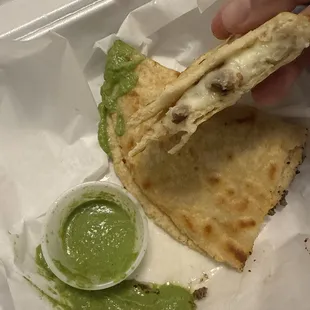 Cooked tortilla that is filled with cheese and folded in half.