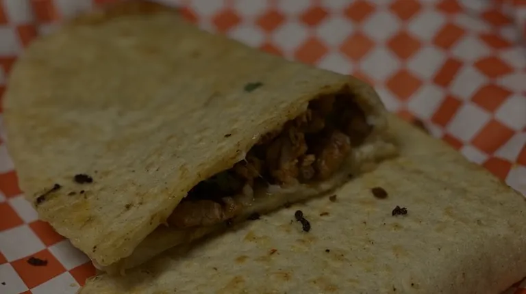 Folded tortilla with a variety of fillings such as meat or beans.