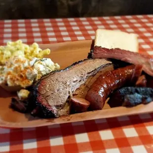 Ribs, brisket, sausage, potato salad, bread slices, and mac-n-cheese.