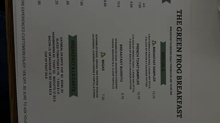 Service is competent but hampered by a kitchen that is very slow. Restaurant is sparsely occupied, 5 pm on a Saturday. It has been 45 mins and still waiting on a chicken fried steak. What little food has been delivered (a side salad) has been fine but nothing to write home about. Many "best this" and "best that" signs on the wall inside. It strains credibility of the publications proclaiming these accolades to believe the Green Frog earned any of them.Update: chicken fried steak delivered. Average at best.
