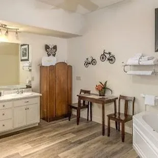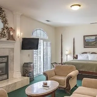 This room has a King bed, fireplace, full bathroom and kitchen. Including outside private sitting area. Very spacious and romantic.