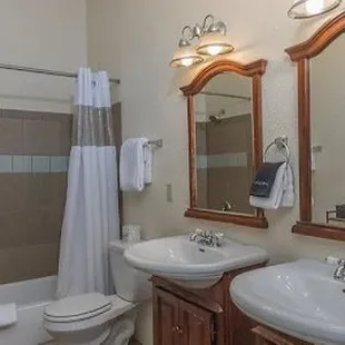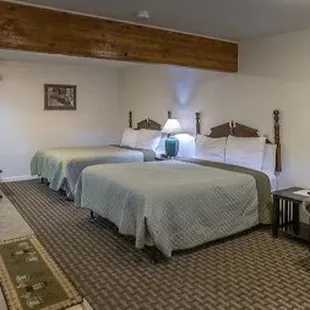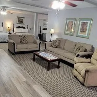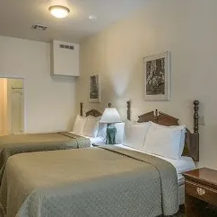 This room has two Queen beds, large sitting and dinning area, full bathroom. Also has a pull out couch. Great for a familia of 6.