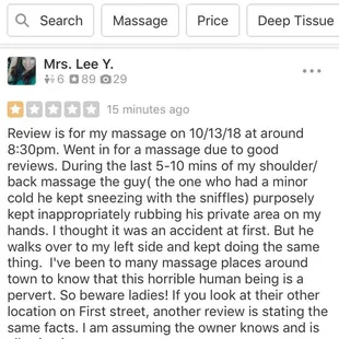 I like coming here to get a combination massage. Table and foot massage. I always fall asleep and feel very relaxed. Only thing is I swear last time dude farted while massage me and sometimes they be coughing so I don't want all of that while trying to relax lmao