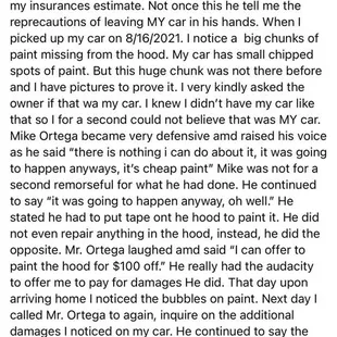 DO NOT COME HERE!! Mike Ortega will be the example of this company. He worked on a friend of mines car, and when she picked up it, there was a chunk of paint missing from the top of her hood, that was missing prior to her dropping it off. Mike Ortega argued that was going to happen anyway as he repaired her car. Did not offer to fix the damage he caused and had no remorse. When she made a complaint he then lied about the damage he had made on my friends car. Again DO NOT COME HERE and If you ever see MIKE ORTEGA tell him I'd give them less stars if I could