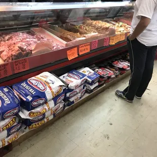 a woman looking at meat