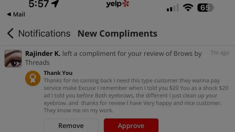 First getting my eyebrows here and never going again she left one of my eyebrow one shape and the other one a different shape when I first walked in by eyebrow were grown out still didn't manage to get them the same walked back in there and told her I have two different shapes like it's really noticeable she blamed it on my eyebrow that I have a scar but I been having that scar since I was 5 it's had nothing to do with the shaping of my eyebrows then she tries to say everyone eyebrows are not the same I said I understand there not identical but there the same shape almost she went on the nobody ever has complain about her work that's it's was only me and she has over 40 years working on eyebrow she has 5 rating and on and on how her work was amazing she didn't care about my eyebrows or even try to Be like here sit down and let me fix them until I ask for my money back she refused