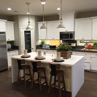 Island is a beautiful walnut with the light gray cabinets and gold accents