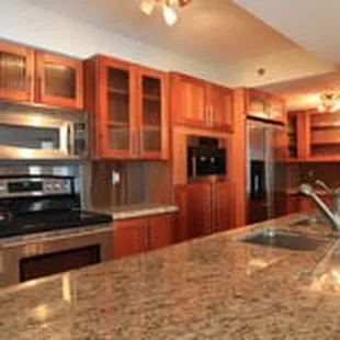 Beautiful installation of new kitchen cabinets, granite countertops, sink, faucets, recessed lighting and hardwood flooring etc