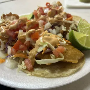Very tasty fish taco. 2 pieces of fried tilapia wrapped in corn tortilla, topped with freshly cut vegetables and a nice sauce to finish it off. Very satisfied and pleased with the cooks asking me questions about how I preferred certain items to be prepared.You don't want to underestimate this place. Burns a jewel inside a Church Market in Southeast Fresno.