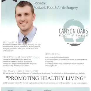 Now 100% great. I have been very harsh on this business in previous reviews. It seems they have a new office staff who are great. Previous staff made one not want to make a follow-up appointment and to look for other providers. The exception back then to this black hole of despair was the blond receptionist, who was welcoming, kind, and caring. Dr. May is a good guy, knowledgeable, and in one appointment immediately stopped my long-time suffering; it has been over a year and still pain-free. I get my preformed orthotics here, as it is worth the little extra to get the proper comfort and cushion they provide in all my shoes. Tell all your friends to come to the new and improved Canyon Oaks; make an appointment yourself to feel better physically and mentally.
