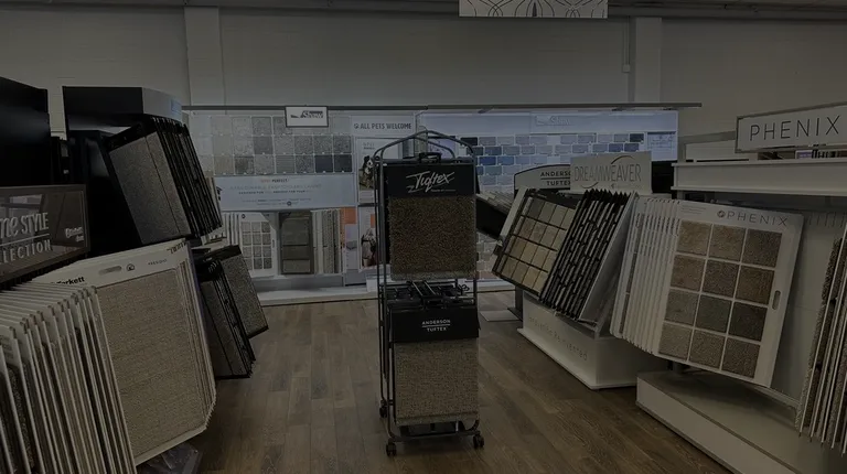 Show room with a variety of selections of flooring, tile, carpet, quartz countertop.