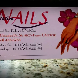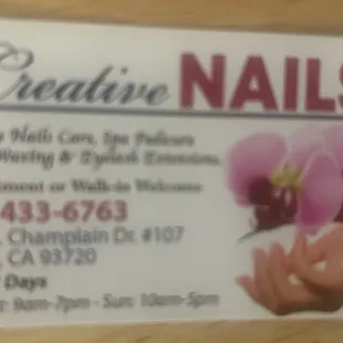 In North Fresno across from the library is Creative Nails. First time ever in this nail salon. Before returning to work I was in need of a great gel manicure. At a reasonable price they saw me right away in the morning with no appointment. I picked out my nail color and they got to work. One of my nails was chipped and the nail technician fixed it at no extra cost. Welcoming as soon as you enter the door and clean for a nail salon. Parking is available out front of the salon. I highly recommend you walk or drive whatever your preference to check out Creative Nails located on Champlain Dr. for excellent service they provide to you.