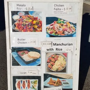 Masala fries, veggie paneer taco, chicken tikki taco, samosas