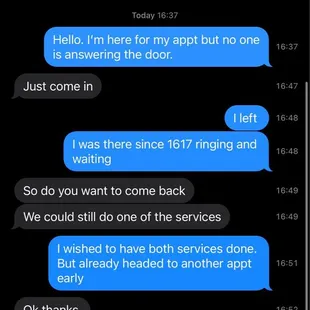 I scheduled an appointment via text and was given their availability. I went ahead and selected my preferred time, and received a text saying I'm all set. Leading up to my appointment, I also received automated texts regarding my appointment. I confirmed those as well.The day of my appointment, I show up 15 minutes early and the door is locked, the lights are off, and no one is responding to my calls or texts. What a shame.I took time off work and drove out of my way to come get my wax done. Why confirm appointments if you forget to even service your clients?Very unprofessional. Learn to respect people's time. I'll be taking my services elsewhere