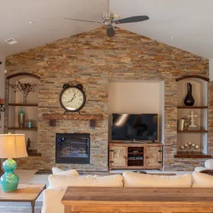 a living room with a fireplace and entertainment center