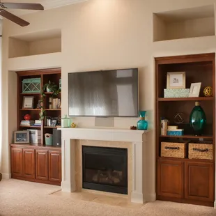 a living room with built in cabinets and a fireplace