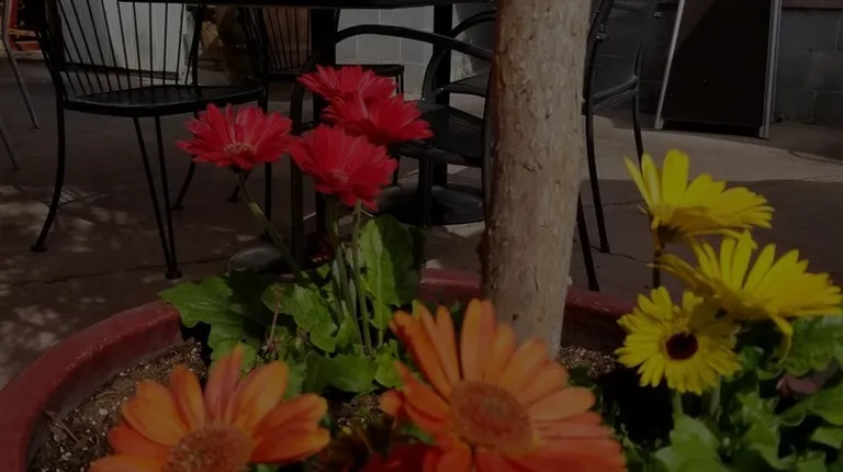 Patio seating with beautiful flowers around