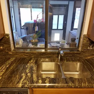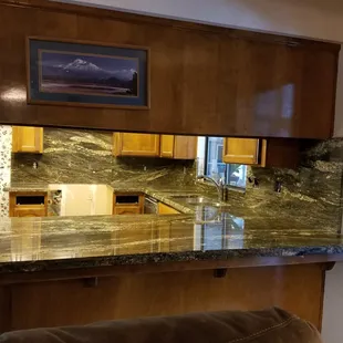 a kitchen with granite counter tops