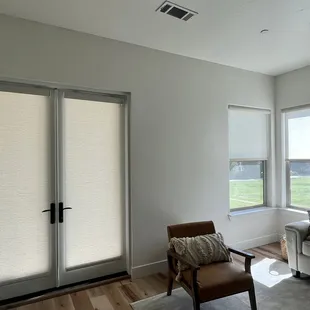 Top shelf tilt lover shutters, great for keeping the heat in and cold out! Paired with a motorized shade for the back sliding door!