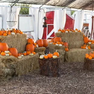 Hay bale "living room" covered in pumpkins. Great photo opportunity!