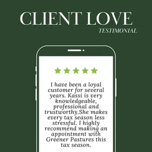 I've been going to Kassi since 2016. Was sad that she moved to Texas but still happy that she is around during tax season because she is the only person I trust for this matter. Kassi has always given me the best service, always willing to go above and beyond to make sure my return is as high as possible and always helped me out with advice for retirement. She will meet with you either in person or virtually, which makes it so much easier when you run a busy schedule. I wouldn't go to anyone else. Kassi and her team are the best in the business!