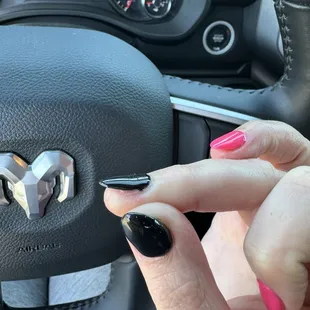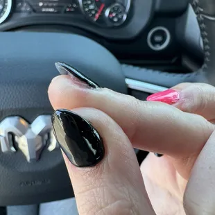 I went in for a new full set with gel polish & my daughter also got a basic manicure. The shape of the nails are perfect - just what I wanted. The problem I had was with the gel. I wanted "cat eye" polish & she said it looks best on black. OK I got my nails painted black & when she put the "cat eye" coat on and used the magnetic tool to give it the look it's supposed to have. Well either it didn't work or she didn't know what she was doing. I said I would choose something else & she ignored me & hurried to do the rest of my second hand, put oil on, & said thank you then got up and walked away. So now I have black nails with a glittery overcoat & my left hand isn't even the same as my right. FOUR of them tried to help her do it right & FOUR of them knew I wasn't happy.