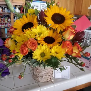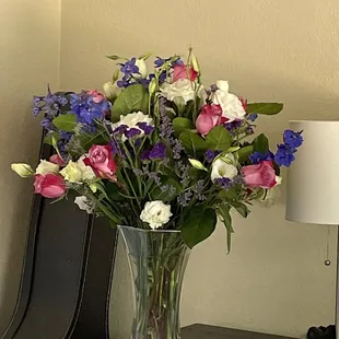 I quite literally GASPED when I saw the bouquet my husband got for me. We are celebrating 13 years together and 3 years of marriage today. Every year he gets me beautiful flowers and he always tells me "I don't know how I'm going to top the next ones" and this year I was blown away when he walked in. They were incredible. My husband said he just told them the colors and a few specific flowers and they put together the most romantic and beautiful arrangement ! Thank you to the staff, I will cherish them truly.