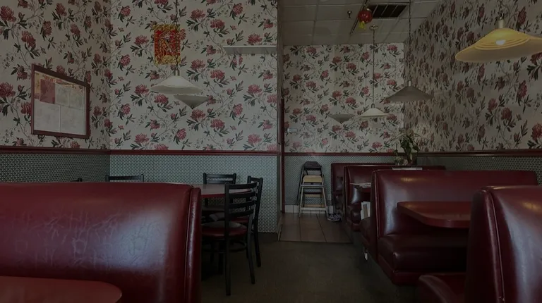 Intensely red, booth filled Mom & Pop Chinese restaurant. Floral wallpaper combined with dark red leather and dark wood seating gives a cave-like impression. Doing the most with the space means narrow walkways and tight corners. Unexpectedly, the main entrance with the hostess counter and cashier is on the side of the building, not the door facing the North Marks Avenue parking lot. Menu has standard favorites as well as noodles cooked with various styles.