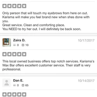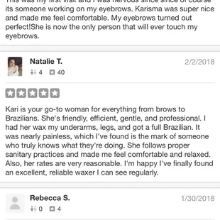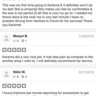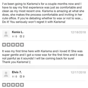 Top notch place that was exceptionally clean. Karisma is a very sweet young lady with a magic touch. I received a complete back wax and there is not one strand of hair remaining. I was also amazed at how minimally painful it was. She does a great job and has a wonderful personality. I highly recommend her services. Thank you