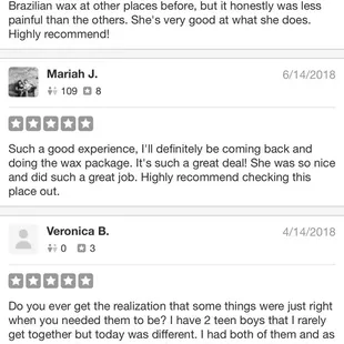 Let me just say, she has such a sweet soul! Great energy from the moment I walked in. I am in love with the services I received! It was my first time getting a Brazilian and let me tell you its a life changer. She made it so comfortable to where the pain was almost non existent. If your looking into it, BOOK WITH HER, you will not regret it!