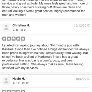 I needed a place close by and found Karisma. I arrived early and she took me right in. My wife and I went in and Karisma made us feel welcome. Karisma waxed my arm hair very carefully. She made sure to ask me if I was in discomfort I said no. We talked and talked all the way through my appointment. It went very fast and I was very pleased with the results. It was a real pleasure meeting Karisma. She is very professional and her and her workplace has a cool and relaxed vibe. Karisma, we'll be seeing you soon. Thank you again.