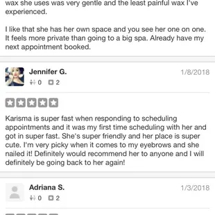 Karisma was professional and did a perfect job on the areas she waxed.Her space was adorable and very very clean. I told her how the wax she uses was very gentle and the least painful wax I've experienced.I like that she has her own space and you see her one on one. It feels more private than going to a big spa. Already have my next appointment booked.