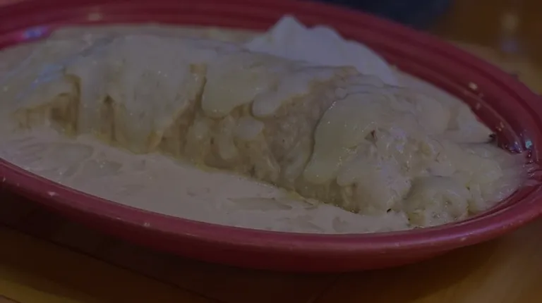 Shrimp enchiladas, with no sauce, only cheese and sour cream on top, per request. Rice and beans on side.