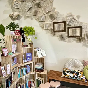 Look at that book wall art, pictures don't do it justice, that embraces the used book area!