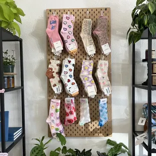 Sock wall by shelves filled with goodies