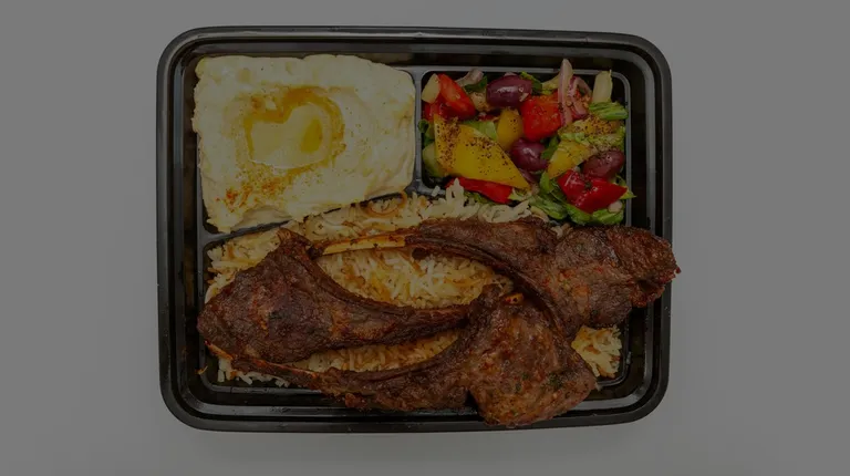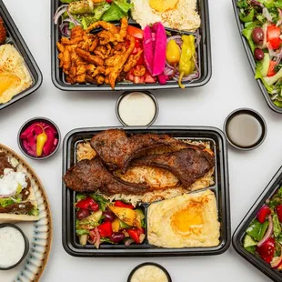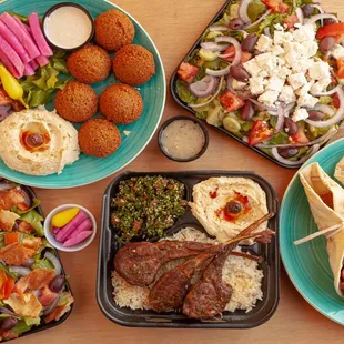 Shawarma plate with grilled veggies and hummus. Lamb chops plate with grilled veggies and house salad. Grape leaves.
