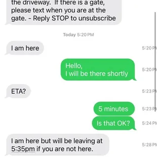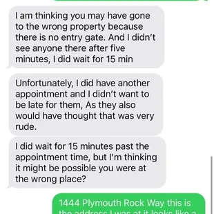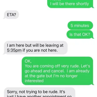 I have been in the hunt for a house/apartment for family member that lives out of town for about 2 weeks and this was by far the worst experience I've had. I will admit my appointment time was scheduled at 5:20 and the time I got to the property was 5:26, the representative that was contacting me through text was very unprofessional. I didn't get a name, but they did not greet me instead just texted saying that they were on the property. After I greeted them and informed them that I would be there shortly then gave me a shorthanded response asking for an ETA. I then responded informing them. I was less than five minutes away and even asked if that was Okay and there response was a threat to leave if I didn't show up. Someone who has worked in customer service their whole life, I understand the frustrations of someone who is late but a 5 minute delay is definitely not a big deal in my book Especially if they gave you a heads up. The representative did apologize for being rude(which I thanked them for), but at that point, I went ahead and canceled the appointment because I was no longer interested in renting the property or viewing it. I hope in the future a situation like mine is approached the appropriate way especially for someone who may be a Potential tenant.Also the representative then said I was not at the right property, which I was and then blatantly lied and said they had been waiting for 15 minutes which was absolutely not true. I attached receipts hoping this reaches the right person.