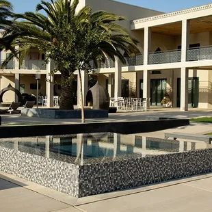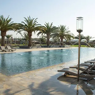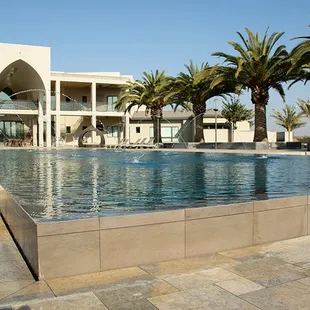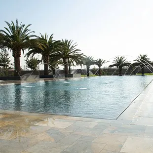a large pool surrounded by palm trees