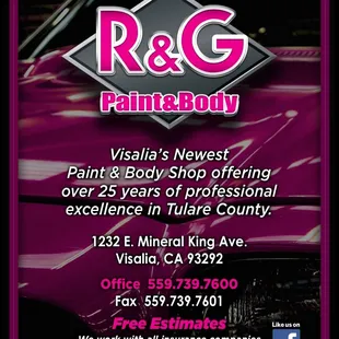 Wow!!! R&G is awesome! It has been quite a while since we received such good service. My husband was looking for someone to paint my car, as it was oxidizing. R&G went above and beyond our expectations. I am extremely happy with the work done. The staff is friendly and professional. The work is excellent and the price is affordable. I would recommend R&G to anyone who needs work done.
