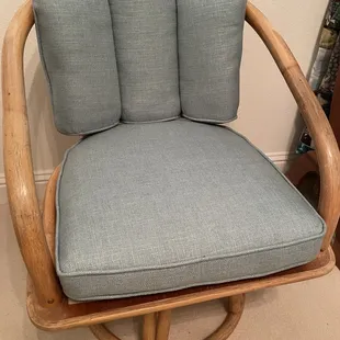 Our kitchen chairs recovered in a Sea Foam Green material! Beautiful!!!