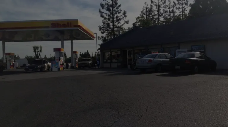 ows a gas station with cars parked in the lot