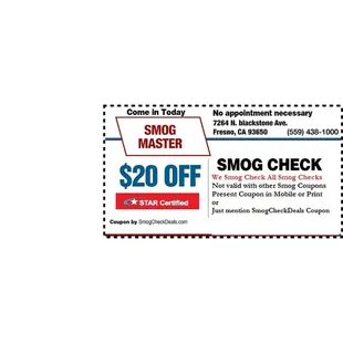 I needed a regular smog for my car. Kevin at Smog Master got my car in quickly and provided friendly service. Price was great with online coupon. Highly Recommend. 5 Stars. Please note: Smog Master is NOT Star Certified.