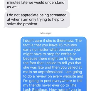 I didn't wanna give it one star!!!!Made an appt with Felix because he was my last choice!!!! because JESSSICA thee best and RACHEL had moved go figure??? I hit traffic coming all the way from Tulare at 6 o'clock had called the number to say I was coming got there 12 mins late he wasn't even in the office when I got there so when he walked in the office there was NO HELLO!!! NO ACKNOWLEDGMENT!!! NO NOTHING!!! He walks over looks at the computer and says I'm leaving I only wait 15 mins!!!With his smerk he says OH CALL FOR ANOTHER APPT SORRY!!! COMING FROM TULARE I WAS UPSET !!!!I went to my car and texted the number and got this!! WISH I COULD PASTE THE TEXT MESSAGE picture!!!I am so sorry I let him know you were on the way he did not tell me he was leaving!!!!Told the person who ever was texting me that I came from outta town and that there was traffic and I was soooooo upset and that people should learn to have better customer service!!!! Not just a DIVA ATTITUDE and this is what I got with no response back since ugh!!!!I completely agree with you Kelly, I have already contacted my boss and let her know the situation. I am hoping we can give you a discount and schedule you with one of our girls. Thanks for showing WONDERFUL SERVICE AND COMPASSION TO YOUR LOYAL CUSTOMERS LASH BOUTIQUE...