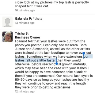 The application looks beautiful really does, I've been getting my lashes done for a couple of months but I decided to take a break on them and let them all fall off on there own and OMFG My lashes are short as fuck!!! I had no idea scissors were involved, but they obviously were because my lashes are perfectly cut short!!! I went in with long lashes that everyone thought I had false lashes on and I ended up with short fuckin lashes!!!!!!! Literally so pissed! My intention was just to have fuller lashes to go with my long lashes!!! I got what I wanted but only when I had the extensions on! Now I am left with fucked up short lashes!! Do not make the mistake and make an appointment here!! You'll like how they look but when u take them off you're pretty much left with fucked up lashes. I don't know if this is done on purpose so we keep going back. But I think I know how my own lashes looked before especially always getting compliments on them. The lash boutique is a fuck up nothing professional about them!