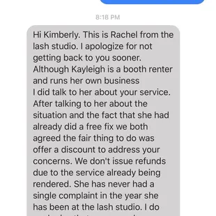 The owner reached out to me apologizing and offered me a classic fill at no charge. It was a nice gesture. I feel this place needs better communication between the staff. The online booking system needs to be worked out too. I got 2 text notifications from their booking system, yet was told the lash tech didn't know she had an appointment.