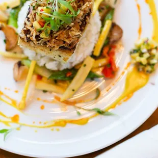 This place is DELISH! The female bartender gives great service too! Make sure to get their awesome ahi, it has so many wonderful flavors and textures-not to mention its looks like a beautiful masterpiece! I also got their pork chop and I finished all of it, sadly I had NO leftovers! The only thing I tried but didn't love was their key lime pie cheesecake, I didn't care for the crust and I left that one behind...