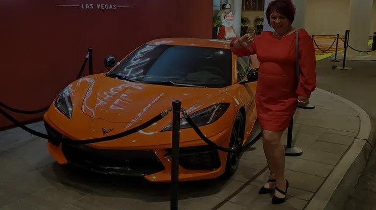 a woman standing next to a red sports car